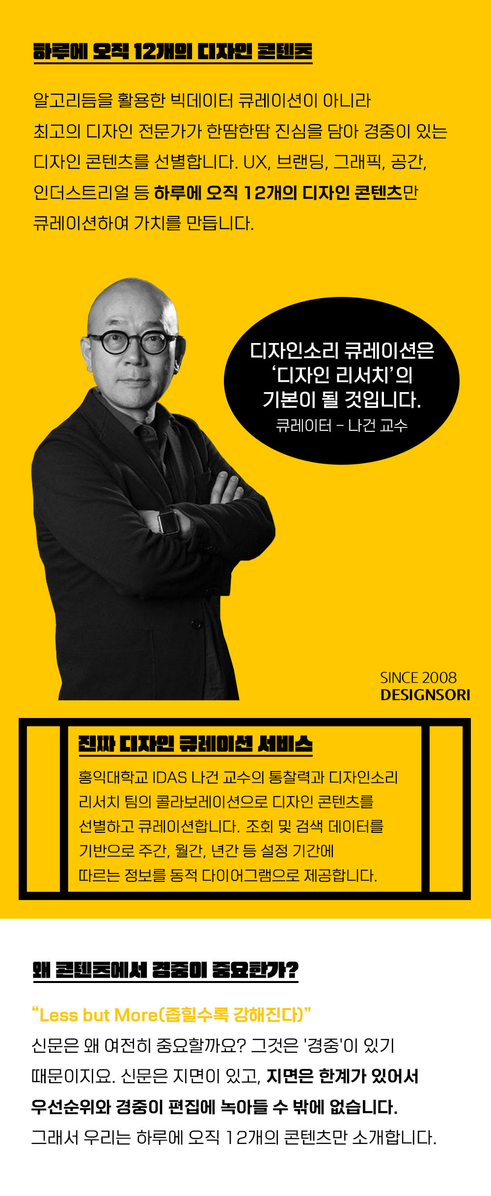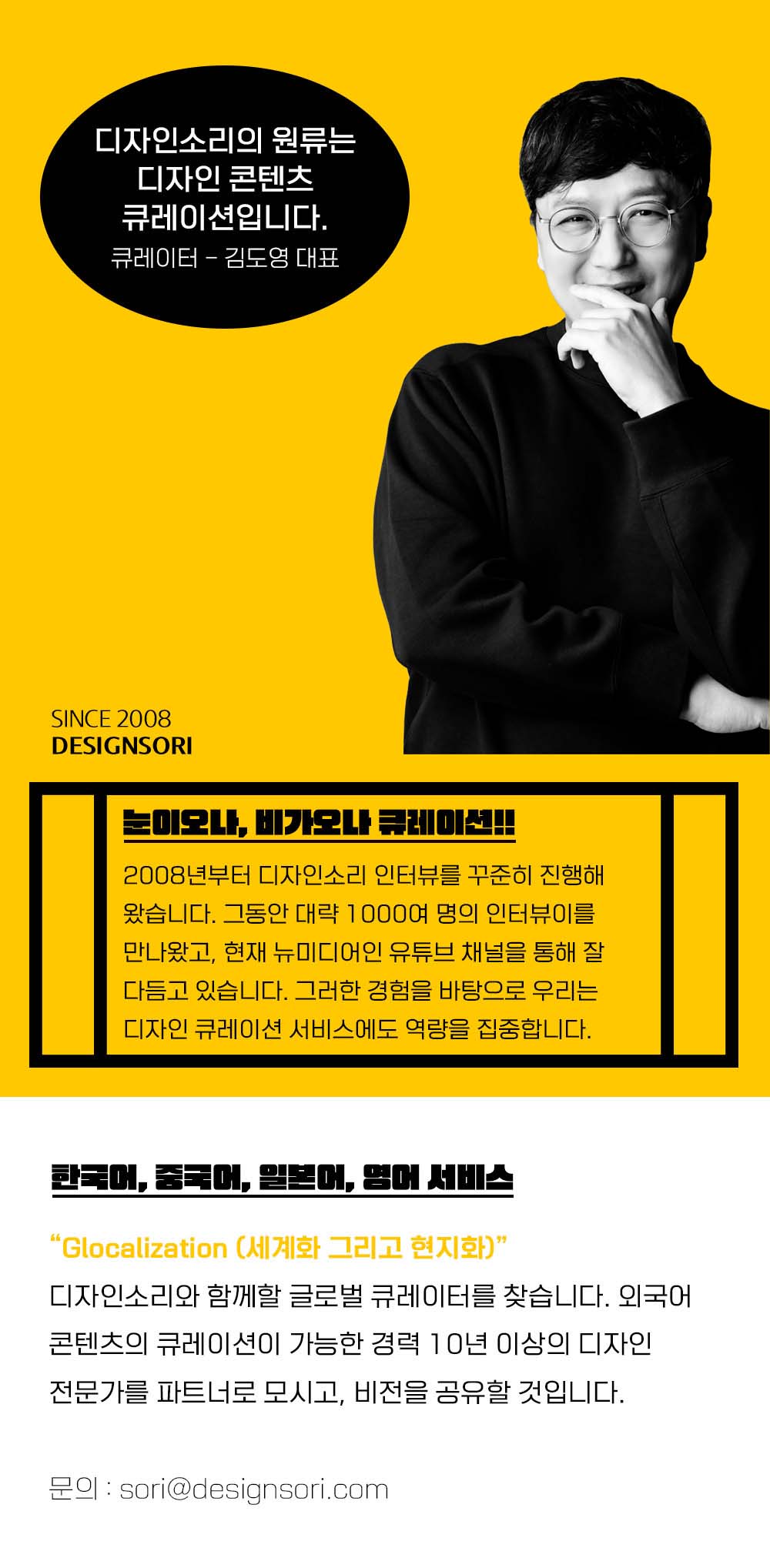 우리는 콘텐츠를 만들지 않는다. 우리는 시간을 견디는 기억을 만든다. 이것이 우리가 존재하는 이유다. 우리는 디자인소리다. 디자인의 본질을 기록하고, 그 이야기를 역사에 남긴다. 그리고 그 기록이 미래의 누군가에게 다시 영감이 될 것임을 믿는다.