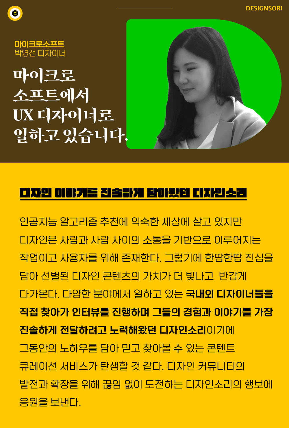 디자인소리는 2008년부터 한국을 대표하는 디자인 아카이브 미디어로서, 시대를 관통하는 디자이너의 목소리를 기록해왔습니다. 우리는 디자인을 단순한 결과물로 보지 않습니다. 그 안에 담긴 사유의 궤적, 창작자가 마주한 맥락과 선택, 그리고 그 과정에서 피어난 철학을 세밀하게 담아냅니다. 화려한 완성품 뒤에는 수많은 고민과 실험, 실패와 발견이 존재하며, 우리는 그 모든 흔적을 존중하며 기록합니다. 디자인은 소비되는 트렌드가 아니라, 시간이 지나도 사라지지 않는 가치이자 후대에 전해져야 할 문화적·시대적 유산입니다.