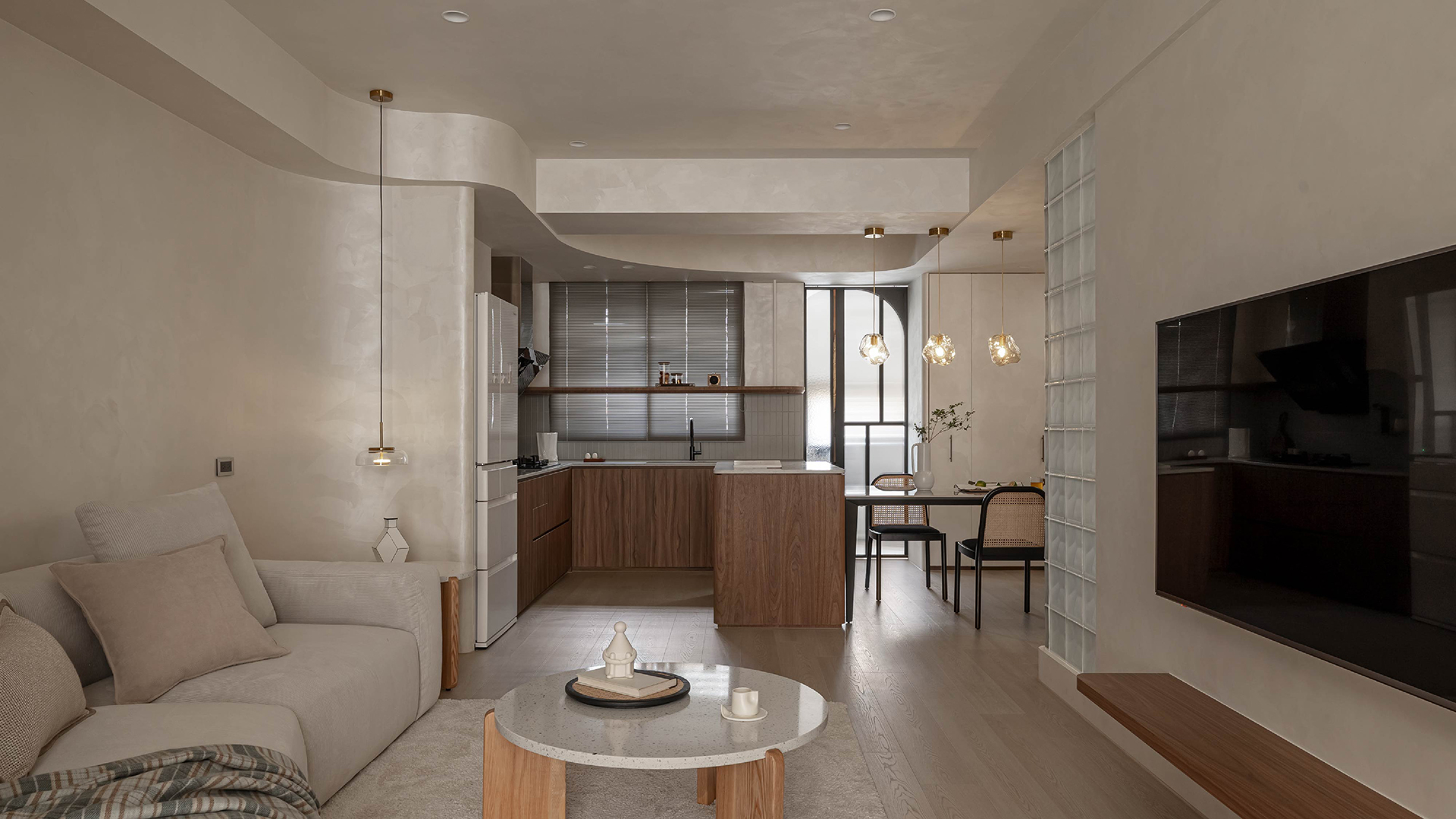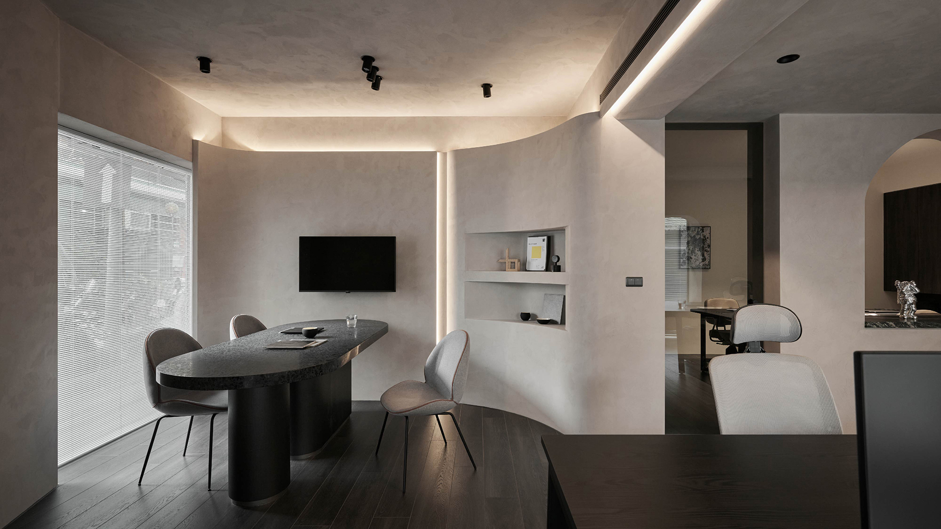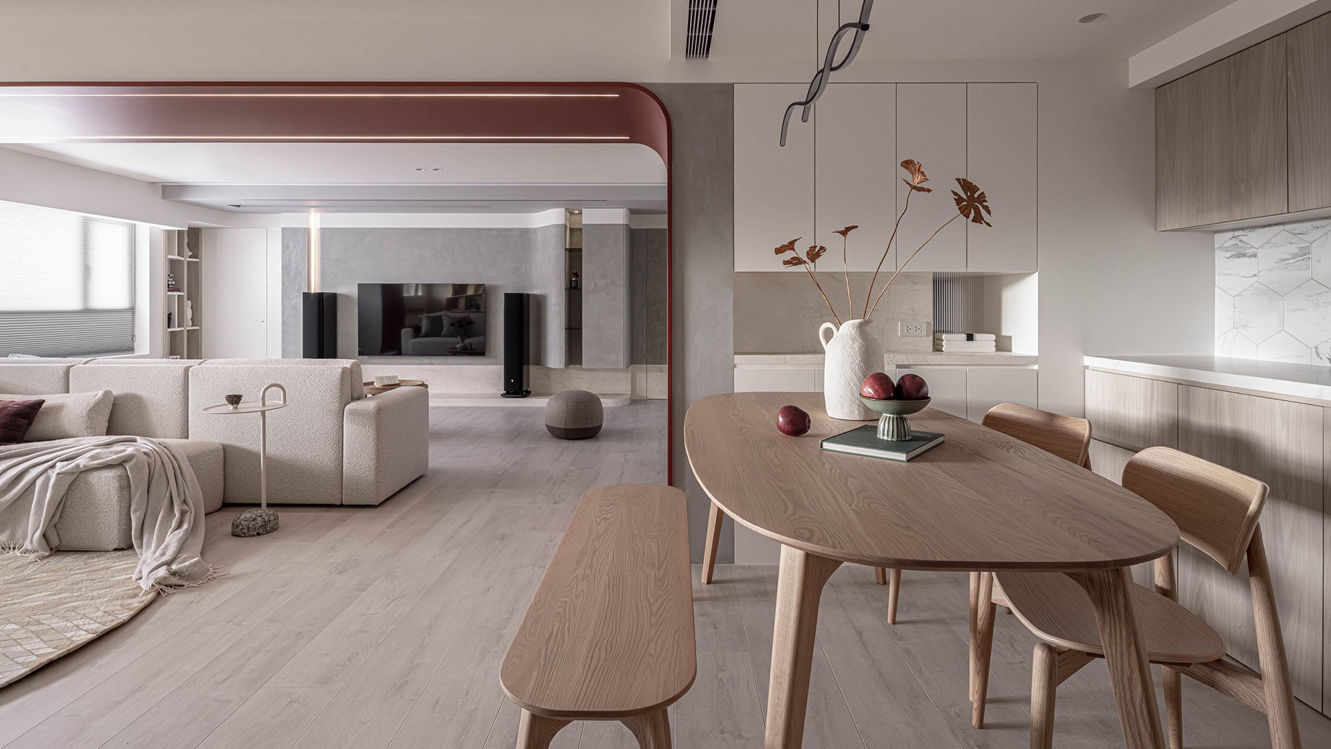 K-DESIGN AWARD 2023 위너를 수상한 ‘Morii’를 소개합니다. 모리 프로젝트는 40㎡의 일본식 주택으로 현대적인 북유럽 스타일을 특징으로 합니다. 저채도 회색 톤의 공간에 붉은 페인트를 사용하여 색상 층을 강조했습니다. 공용 공간에서는 대조적인 붉은색 기둥과 보를 사용하여 공간을 미묘하게 나눕니다. 이렇게 하면 거실과 독서 구역이 독립적으로 존재할 수 있으면서도 전체 공간의 일체감은 유지됩니다. 또한 두꺼운 나무 판자와 대비되는 층층이 쌓인 패널로 열린 책장을 형성하여 시각적으로 자유롭고 넓은 분위기를 연출했습니다. 이를 통해 지적인 공간에서 휴식과 기분 전환을 위한 공간을 만들었습니다. 개인 공간의 마스터 침실은 부분 파티션으로 드레싱 구역을 나누고, 침대 옆 테이블을 화장대까지 연장하여 장벽 없이 자유로운 흐름의 레이아웃을 형성합니다. 넉넉한 조명이 이 레이아웃을 더욱 돋보이게 해주죠. 게스트 침실은 연꽃 분홍색을 주 색상으로 사용하며, 천장, 헤드보드, 수납장에 아크 디자인을 적용하여 부드럽고 따뜻한 분위기를 조성합니다.