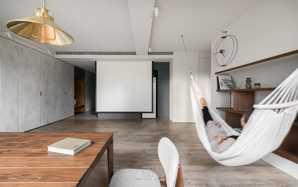 A skiff : 이 작품은 디자인 총감독의 자택으로, 네 가족의 생활 패턴을 고려한 주거 공간 디자인입니다. 샤워실을 하나로 통합하고 두 개의 화장실 사이에서 공유하는 방식으로, 남는 공간을 주 침실 내 서재로 활용했습니다. 두 자녀가 청소년기에 접어들어 곧 학업을 위해 집을 떠날 예정이므로, 아들들의 방은 위층에 침대, 아래쪽에 옷걸이와 책상을 배치해 공간을 절약했습니다. 가족들이 함께 모일 수 있는 거실과 식당을 확장했고, 거실에는 텔레비전 대신 가족 간의 대화와 소통이 이루어지도록 디자인했습니다. 함께 식사하고 영화를 보며 닌텐도 스위치를 즐길 수 있는 공간으로, 빈백 의자와 전동 해먹이 있어 영화를 보다 잠들 정도로 편안한 장소입니다.