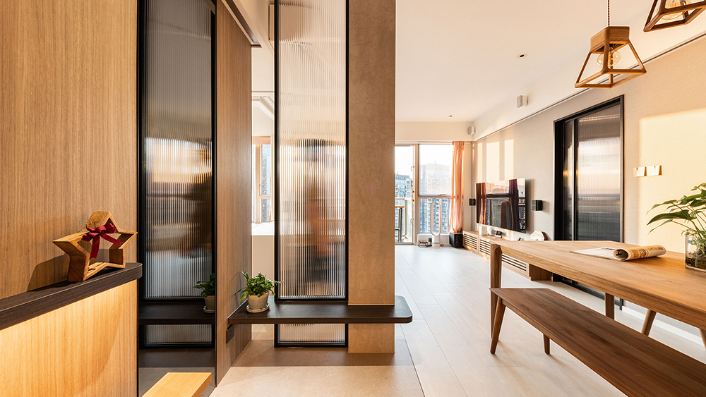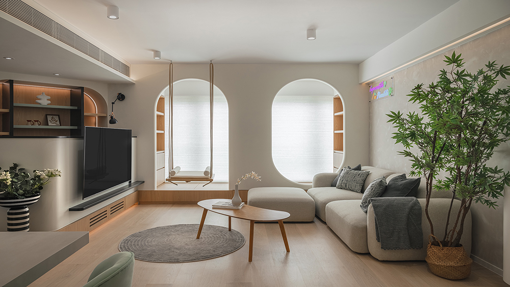 일반적으로 아이들이 그네를 타고 싶으면 대부분 공원이나 놀이터에 가야 합니다. 하지만 집주인은 딸이 행복하길 바라는 마음에서 집 안에 그네를 설치해 달라고 요청했습니다. 홍콩처럼 공간의 쓰임이 중요한 곳에서, 실내 그네는 큰 도전이었죠. 우리는 놀이적인 분위기를 디자인에 담아 아이에게 행복한 어린 시절을 선사하고자 했습니다. 물론 그네를 설계하는 과정에서 가장 먼저 고려한 것은 안전이었어요. 예를 들어, 그네를 사용할 때 주변 물체와 충돌하지 않도록 하거나 하중을 견딜 수 있도록 하는 방법을 고민했습니다. 거실 공간은 그네가 중심이 되는 특징적인 장소가 되었으며, 아치형 벽 뒤에는 휴식을 위한 공간을 설계해 가족이 자연광 속에서 몸과 마음을 편안히 쉴 수 있도록 했습니다.