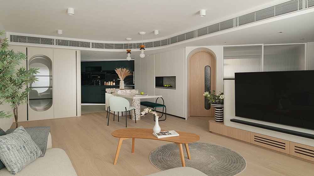 Harmony (K-DESIGN AWARD 2024 수상작) : 이 프로젝트는 제가 가장 좋아하는 프로젝트 중 하나입니다. 이 집에서 생활하는 부부는 인테리어 디자인에 큰 관심이 있었고, 공간 구분, 선의 형태, 소재 및 조명에 대해 구체적인 요구를 했습니다. 그리고 그들의 딸을 기쁘게 해 줄 쾌활한 분위기의 집을 원했죠. 홍콩에서 그네가 있는 거실은 매우 보기 드문 장면입니다. 우리는 이 재미있는 요소를 평온한 오아시스로 변형시켰습니다. 그네는 창가에 배치된 플랫폼에 설치되었으며, 숨겨진 수납 공간도 포함되어 있습니다. 우아한 아치형 벽이 개방감을 주고 자연광을 끌어들여 거실을 돋보이게 만들었습니다. 그네는 아름다움과 실용성을 동시에 제공하며, 곡선과 밝은 색조, 다양한 소재로 스파 같은 분위기를 연출했습니다. 침실과 욕실은 넉넉한 수납 공간을 연결해 공간의 넓이를 유지하며, 색상은 부드러운 톤과 따뜻한 나무 색조로 깊이를 더했습니다. 거실과 주방 사이에는 짙은 녹색과 테라조 재료로 만든 아일랜드가 사용되어 색상의 연속성을 제공하고, 따뜻함과 시각적 통일감을 높였습니다. ‘불가능은 없다(Impossible/ I’m Possible)’이라는 네온 사인 또한 딸을 위해 디자인 했습니다. 이 네온 사인은 영감과 색감, 공간의 초점을 이루는 요소입니다.
