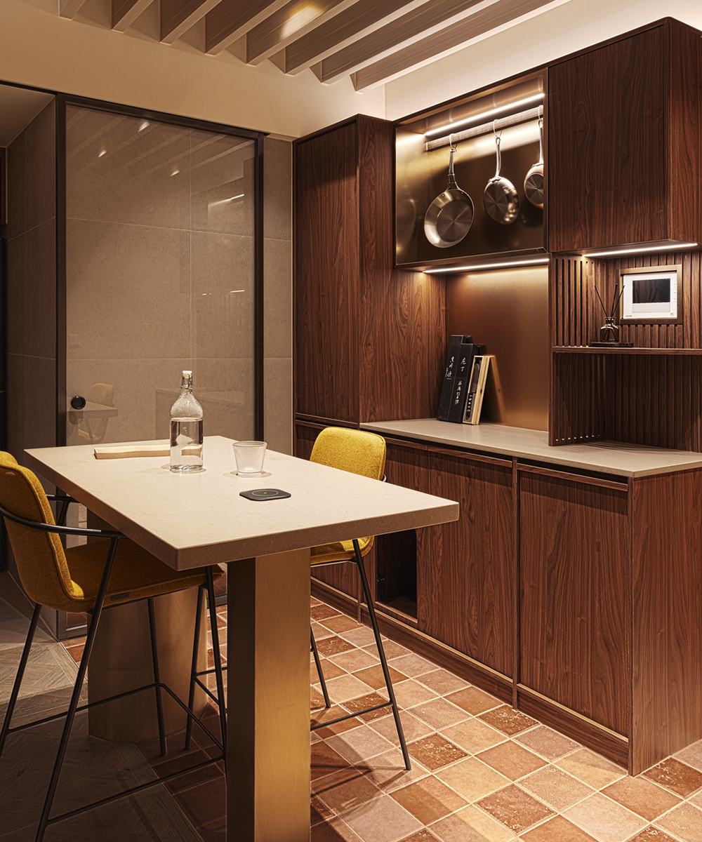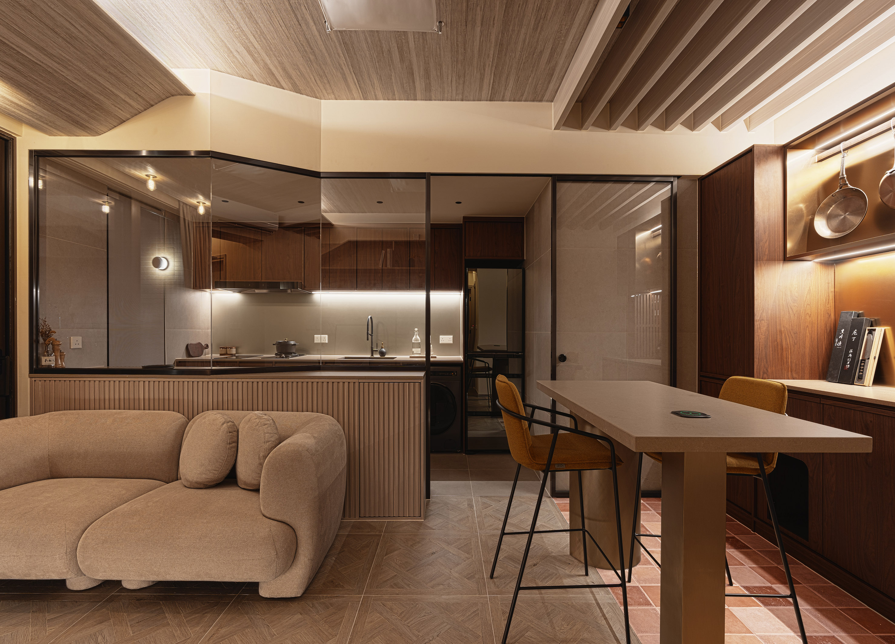 Staircase : 이 디자인은 대조와 연속성이 어우러진 작품입니다. 홍콩 금융 지구가 내려다보이는 언덕의 고층 주거 건물에 위치한 이 아파트는 "계단"으로 연결된 안식처입니다. 입구에서 거실의 파노라마 창으로 이어지는 물결 모양의 목재 천장은 도시에서 위로 오르는 계단을 떠올리게 합니다. 따뜻한 목재의 색감과 질감은 차가운 콘크리트 도시와 확연히 구별되죠. 거실과 주방을 분리하는 유리 패널은 계단 디자인을 반영하면서도 공간에 개방감을 더합니다. 흙빛 타일과 월넛 소재 캐비닛이 식사 공간을 구분하며, 부드러운 조명이 이 공간에 세련된 고급스러움을 더합니다.