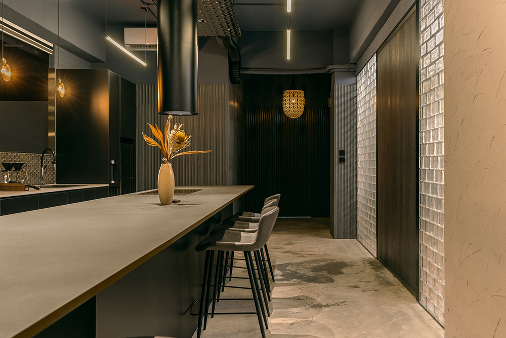 Enchanting Haven (Deco Farmer Studio Office) : 디자인은 삶에서 시작되며, 삶은 곧 경험입니다. 우리 스튜디오는 이 디자인을 통해 새로운 분위기를 전달하고자 했습니다. 리셉션을 지나 사무실로 들어서면, 중앙에 검은 롱 아일랜드 테이블이 따뜻한 조명과 함께 아늑한 분위기를 조성합니다. 이곳에서 고객을 만나거나 동료들과 점심을 즐길 수 있습니다. 스트레스를 받을 때는 팬트리에서 커피를 마시며 휴식을 취할 수도 있습니다. 더 안쪽으로 들어가면 영감을 받을 수 있는 홈 시어터 공간이 나옵니다. 좋아하는 영화를 감상하고 있으면 마치 개인 전용 극장처럼 느껴집니다. 회의실은 유리 타일을 통해 자연광이 스며들도록 디자인되었습니다. 독특한 패턴과 질감의 소재들을 사용해서 새로운 아이디어를 떠오르게 하는 영감의 공간을 제공합니다.