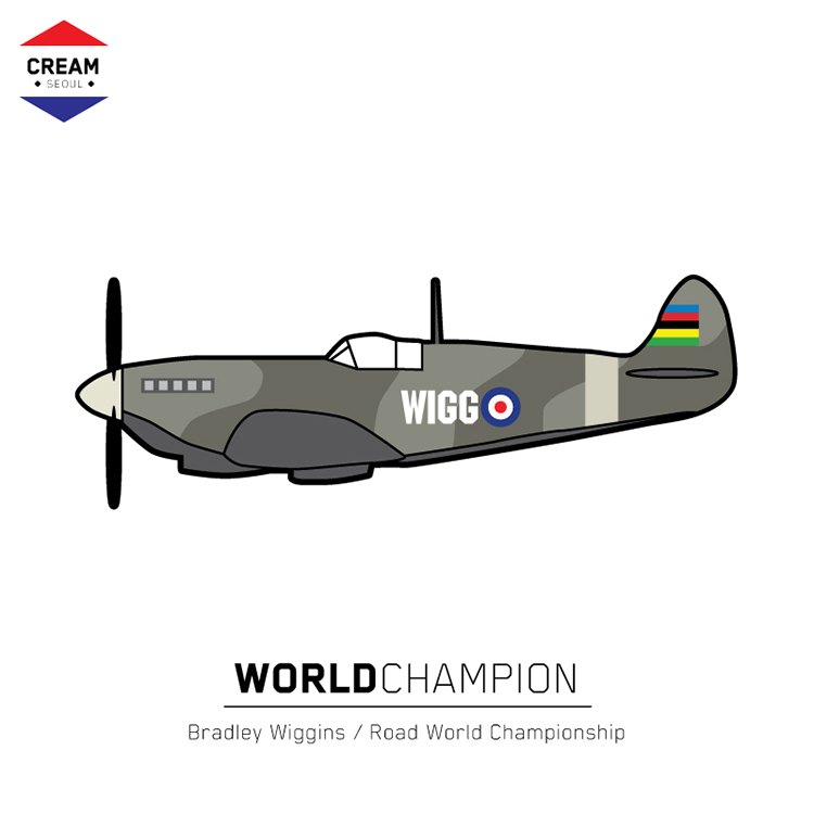 최근 작업 중 가장 마음에 드는 작업인데요. ITT (Individual Time Trial) 세계챔피언에 대한 작업이에요. 간단히 보면 그냥 전투기 한 대 그려놓은 건데요. 우선 이 선수는 Bradley Wiggins이라는 ITT 챔피언을 먹은 영국 선수예요. 별명은 Wiggo이고 영국 공군의 써클로고를 트레이드마크로 사용해요. 그 전년도의 세계챔피언은 Tony Martin이라는 독인 선수예요. 이 선수의 별명인 Panzewagen이라는 과거 악명 높았던 독일군의 장갑차에요. 그래서 Tony Martin을 이기고 챔피언을 차지하게 된 Bradley Wiggins 선수를 과거 2차 대전 당시 연합군의 제공권을 가져다 준 영국산 Spitfire 전투기로 표현했어요. 별거 아니긴 한데 나름대로 스토리를 만들어가며 제가 알던 얕은 지식에 리서치하면서 상당히 즐겁게 작업했더랬죠.