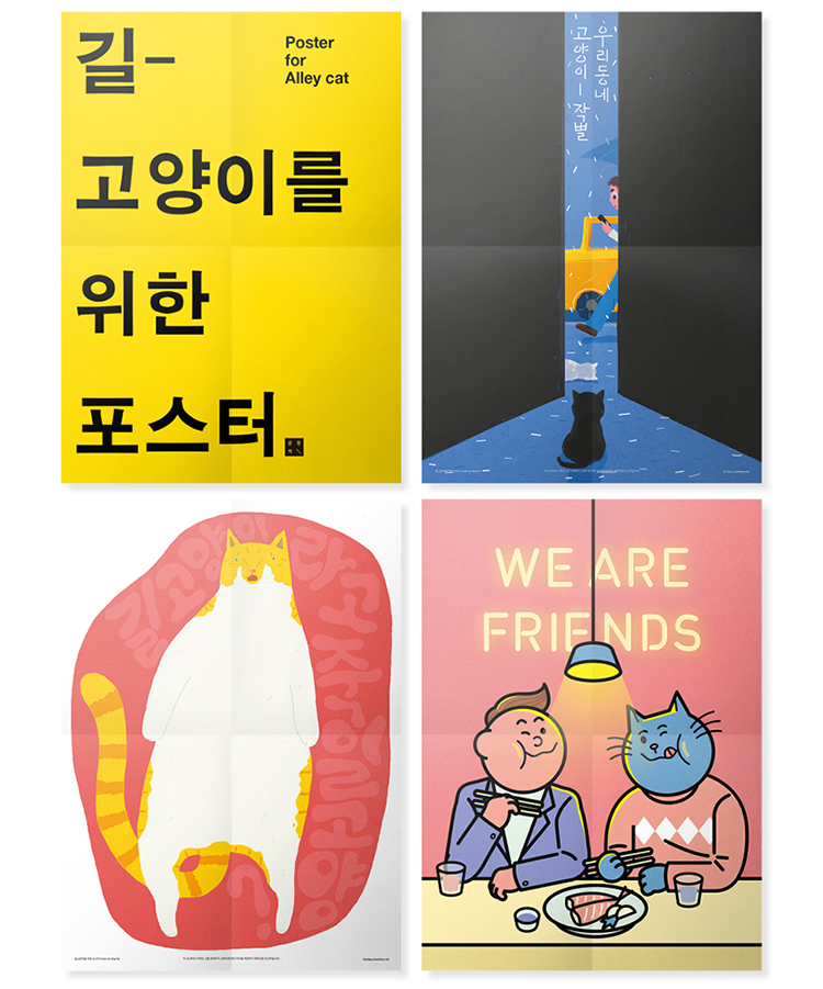앞서 말씀드린 대로 돈을 버는 일 이외에 디자인으로 할 수 있는 일들을 늘 구상해 보고 있습니다. 저희는 이것을 긍프. 긍정적인 프로젝트라고 부르는데요. 이 프로젝트의 하나로 제작된 것이 길고양이를 위한 포스터입니다. 우리 주변에 있는 길고양이를 생태계 일부로 보고 우리와 공존하는 대상으로 생각하길 바라며 포스터를 만들었습니다. 대단한 사회적 메시지가 담겨있지는 않지만, 이윤을 떠나 우리가 말하고 싶었던 메시지를 담은 긍정적인 프로젝트입니다.