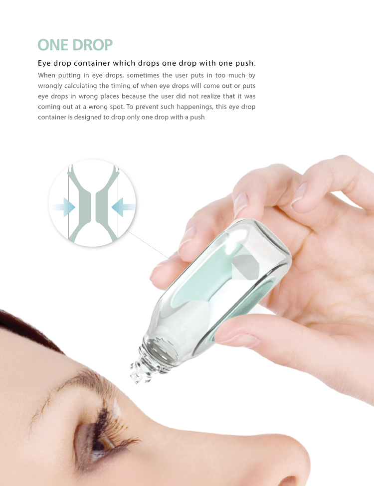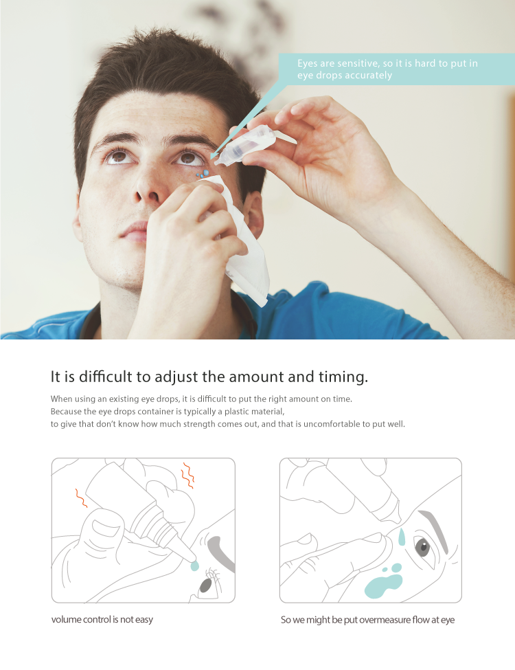 평소 직접 보고 느낀 경험을 통해 페인 포인트를 발견하는 편입니다. 저는 눈이 예민한 편이라 안약이나 렌즈 관련 제품을 사용할 때 어려움을 겪던 일들이 생각났습니다. 기존에 안약을 손쉽게 사용할 수 있는 제품 디자인이 꽤 나와있었지만 좀 더 직관적이고 편리한 방법을 고민하였고, 볼펜, 화장품, 스포이트 등 다른 제품의 속성을 가져와 여러 차례 적용해보던 중 가장 적합한 방법을 찾게 되었습니다.